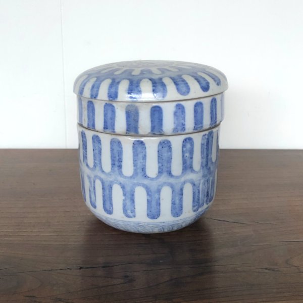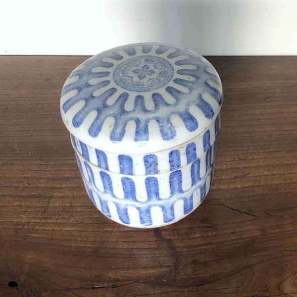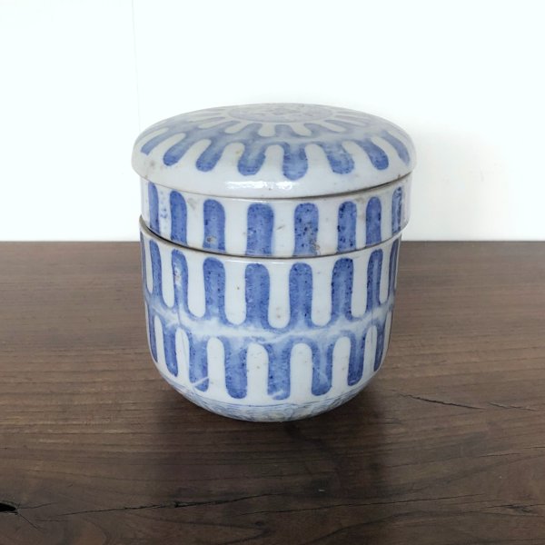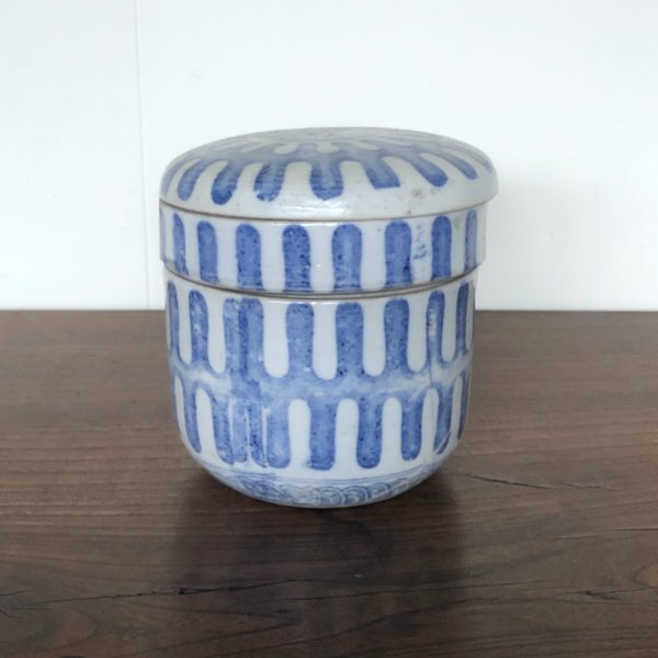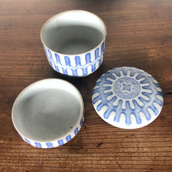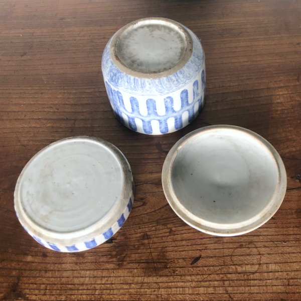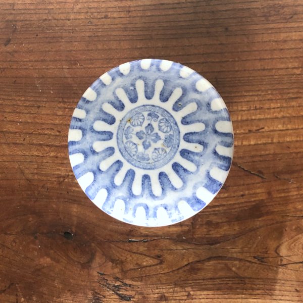 印判の絵の感じや底の感じから、安南系の焼き物ではないかと思います。