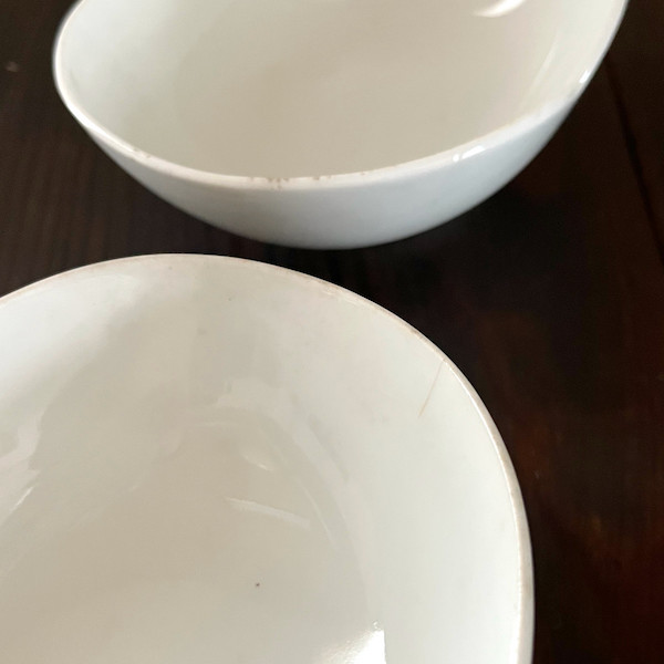 底の感じからだと、砥部焼でしょうか。繊細なつくりで、薄くヒビがある物もあります。